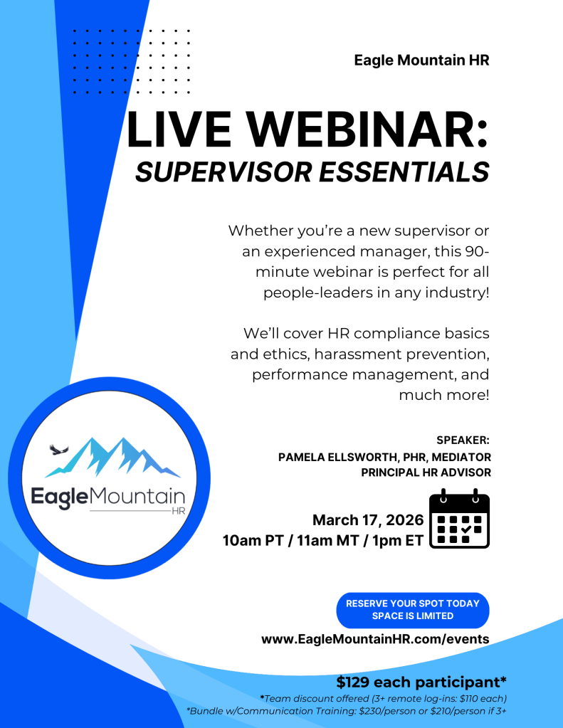 * A confirmation e-mail with training log-in information will be sent to the e-mail address provided within 48 hours. Please check junk or spam e-mail if you haven’t received a confirmation after 48 hours. Contact (208) 918-3035 or admin@eaglemountainhr.com for assistance should you have any questions. Successful registration may not be guaranteed for registrations received within two days prior to day of event, so please be sure to register as soon as possible. Payment is due at time of registration; receipt will be e-mailed within 48 hours of successful registration. We look forward to helping you soar to success!